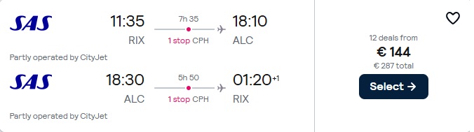 SAS lidojumi no Rīgas uz Alikanti ar pārsēšanos Kopenhāgenā.