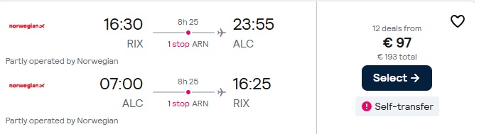 Norwegian lidojumi no Rīgas uz Alikanti ar pārsēšanos Stokholmā.
