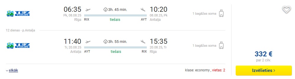 Datumi: 8.-20.08. 166 EUR turp un atpakaļ vienam cilvēkam vai 332 EUR diviem