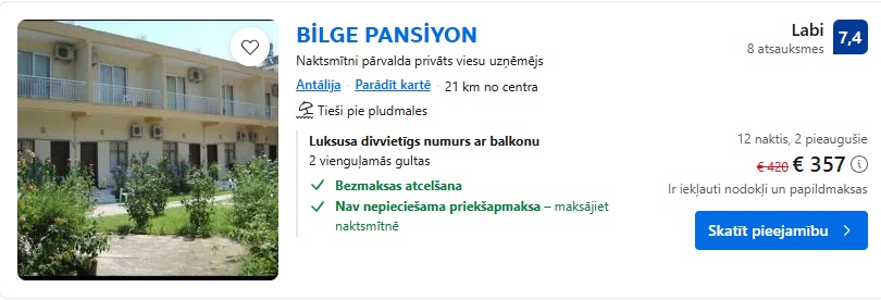 Viesnīca BİLGE PANSİYON. Divvietīgs numurs uz 12 naktīm – 357 EUR.