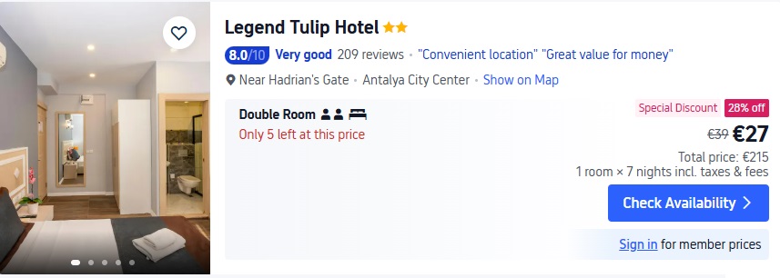 Viesnīca LEGEND TULIP HOTEL. Divvietīgs numurs uz 7 naktīm – 215 EUR.