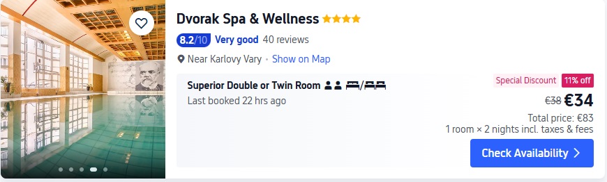 4* viesnīca Dvorak Spa & Wellness. Divvietīgs numurs uz 2 naktīm – 83 EUR.