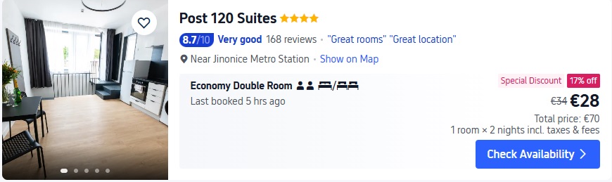 4* viesnīca Post 120 Suites. Divvietīgs numurs uz 2 naktīm – 70 EUR.