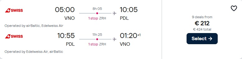 Lidojumi no Viļņas uz Ponta Delgada ar pārsēšanos Cīrihē.