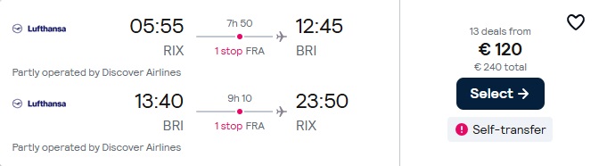 Lufthansa lidojumi no Rīgas uz Bari ar pārsēšanos Frankfurtē.