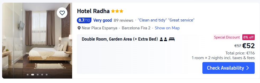 Ērti numuri: viesnīcā Hotel Radha, kas atrodas Hospitalet de Llobregat, ir pieejami ģimenes numuri ar gaisa kondicionētāju, privātām vannas istabām un skatu uz pilsētu. Katrs numurs ir aprīkots ar privātu ieeju, skaņas izolāciju un parketa grīdu.