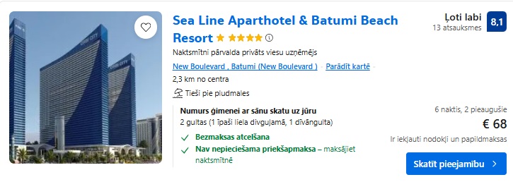 Studija Sea Line Aparthotel & Batumi Beach Resort uz 6 naktīm – 68 EUR.
