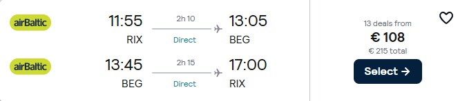 Tiešie Air Baltic lidojumi no Rīgas uz Belgradu.