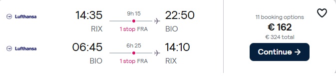 Lufthansa lidojumi no Rīgas uz Bilbao ar pārsēšanos Frankfurtē.