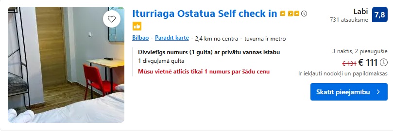 Viesnīca Iturriaga Ostatua Self check in. Divvietīgs numurs uz 3 naktīm – 111 EUR.