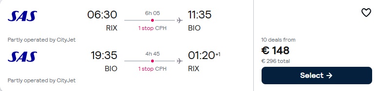SAS lidojumi no Rīgas uz Bilbao ar pārsēšanos Kopenhāgenā.