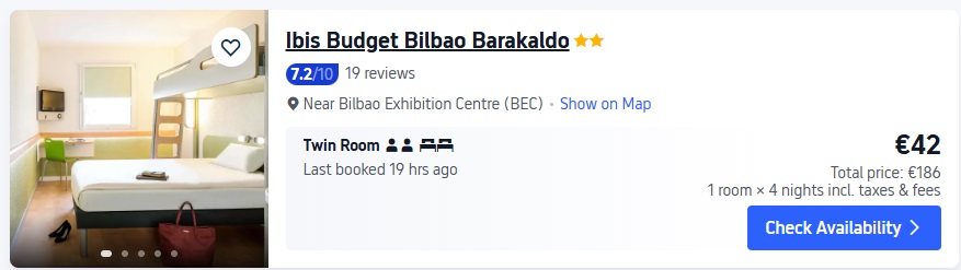 Viesnīca Ibis Budget Bilbao Barakaldo. Divvietīgs numurs uz 4 naktīm – 186 EUR.