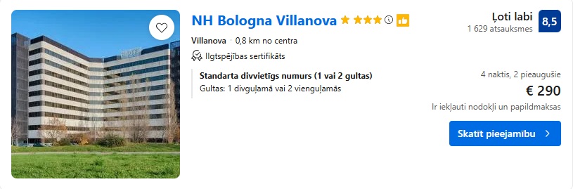 4* viesnīca NH Bologna Villanova. Divvietīgs numurs uz 4 naktīm – 290 EUR.