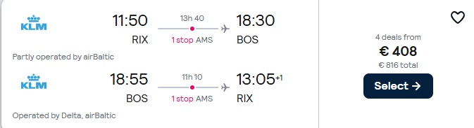 KLM lidojumi no Rīgas uz Bostonu ar pārsēšanos Amsterdamā.