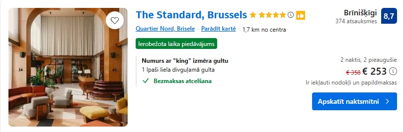 5* viesnīca The Standard, Brussels. Divvietīgs numurs uz 2 naktīm – 253 EUR.