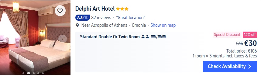Viesnīca atrodas tikai 200 metru attālumā no metro stacijas Omonia, nodrošinot ērtu piekļuvi nozīmīgākajām apskates vietām. Profesionāli darbinieki, kas pārvalda vairākas valodas, sniedz augsta līmeņa pakalpojumus, lai apmierinātu visu viesu prasības. Atēnu Starptautiskā lidosta ir 45 minūšu brauciena attālumā no viesnīcas Delphi Art.