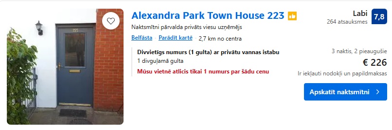 Viesu nams Alexandra Park Town House 223. Divvietīgs numurs uz 3 naktīm – 226 EUR.