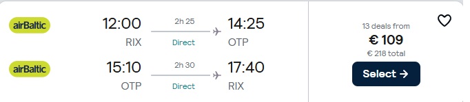 Tiešie Air Baltic lidojumi no Rīgas uz Bukaresti.