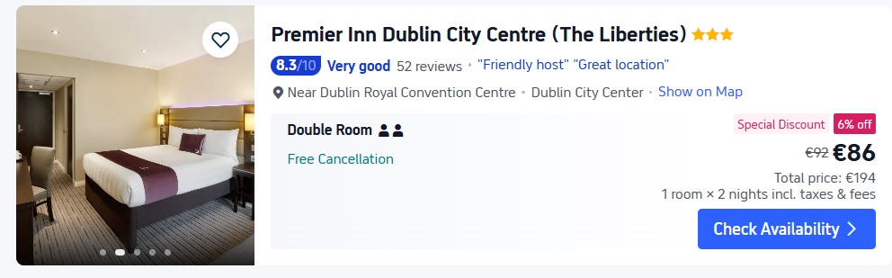 3* viesnīca Premier Inn Dublin City Centre (The Liberties). Divvietīgs numurs uz 2 naktīm – 194 EUR.