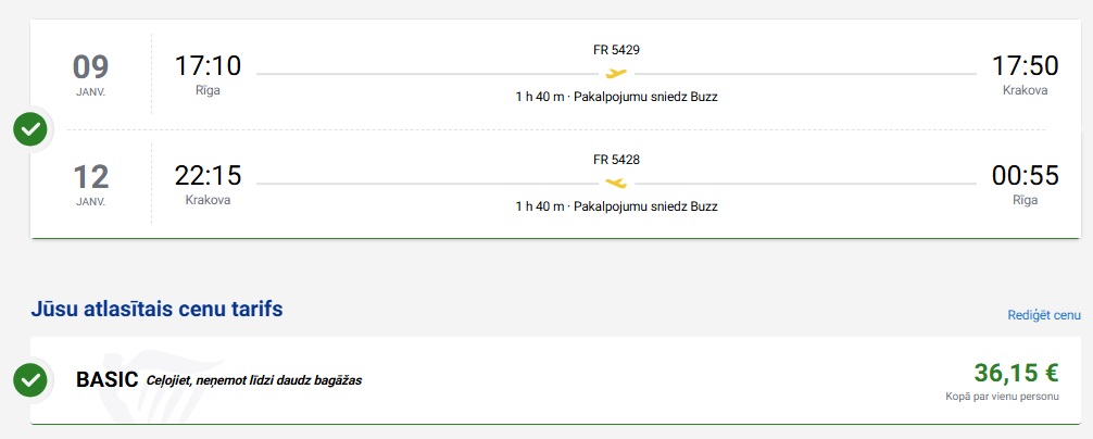 Tiešie Ryanair lidojumi no Rīgas uz Krakovu (bagāža nav iekļauta cenā).