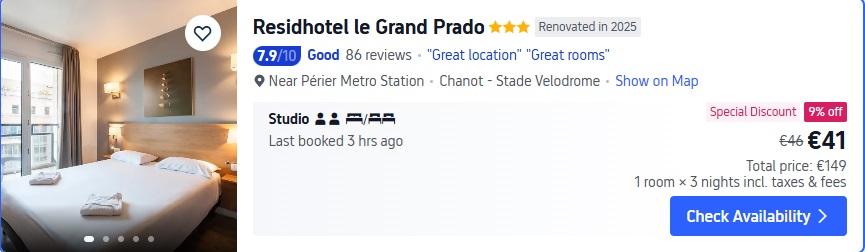 3* viesnīca Residhotel Le Grand Prado. Studija uz 3 naktīm – 149 EUR.