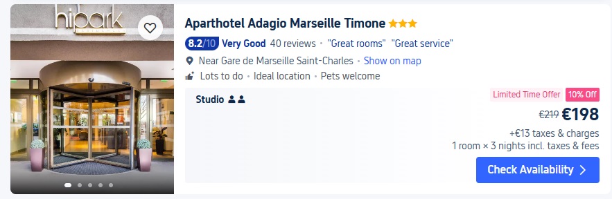 3* viesnīca Aparthotel Adagio Marseille Timone. Studija uz 3 naktīm – 198 EUR.