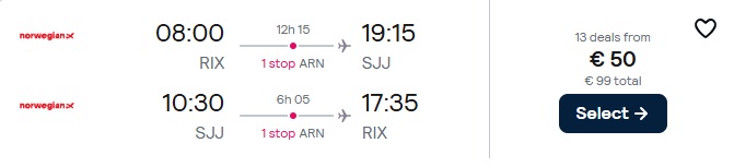 Norwegian lidojumi no Rīgas uz Sarajevu ar pārsēšanos Stokholmā (lidojumi nav savienoti).