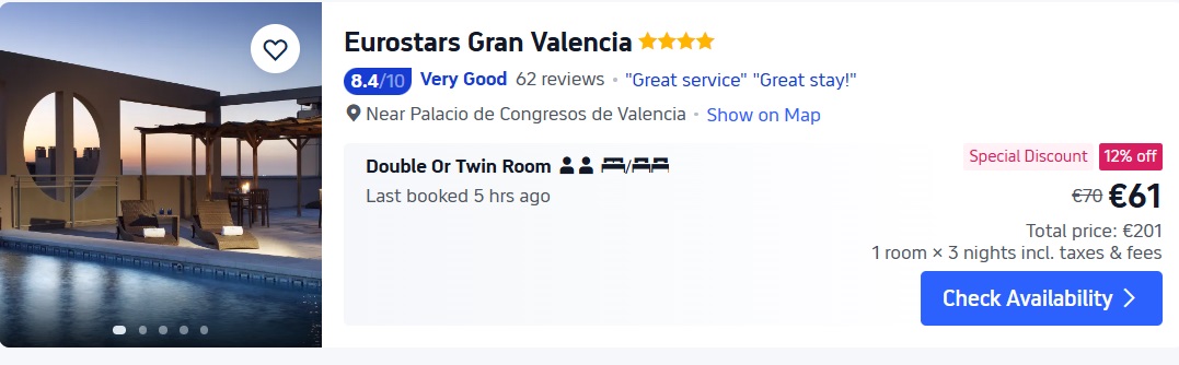 4* viesnīca Eurostars Gran Valencia. Divvietīgs numurs uz 3 naktīm – 201 EUR.