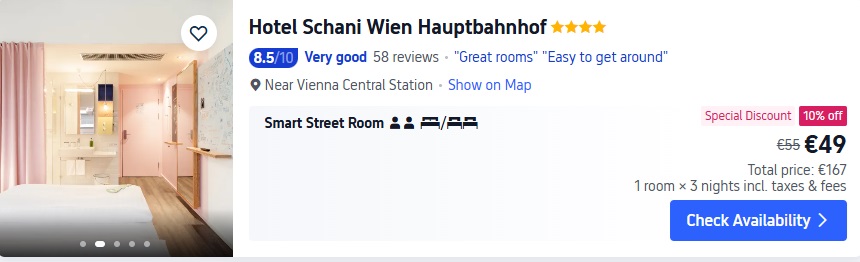 4* viesnīca Hotel Schani Wien Hauptbahnhof. Divvietīgs numurs uz 3 naktīm – 167 EUR.