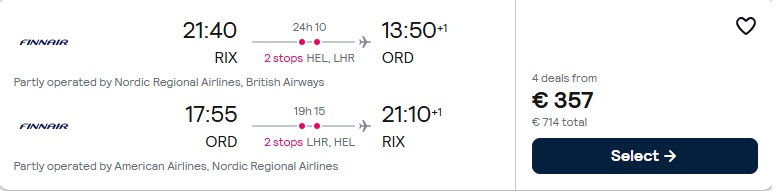 Finnair lidojumi no Rīgas uz Čikāgu ar pārsēšanos Helsinkos un Londonā.