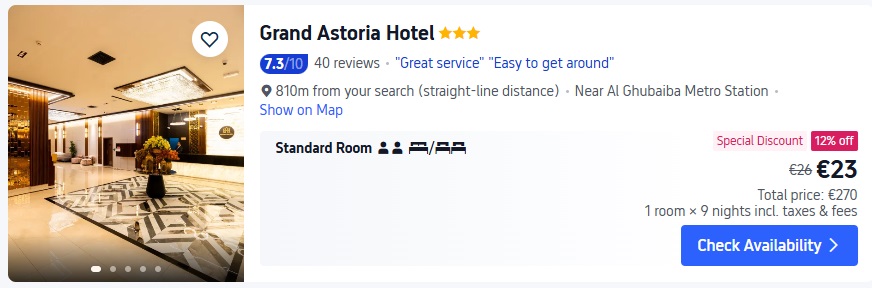 3* viesnīca Grand Astoria Hotel. Divvietīgs numurs uz 9 naktīm – 270 EUR, ar brokastīm – 302 EUR.