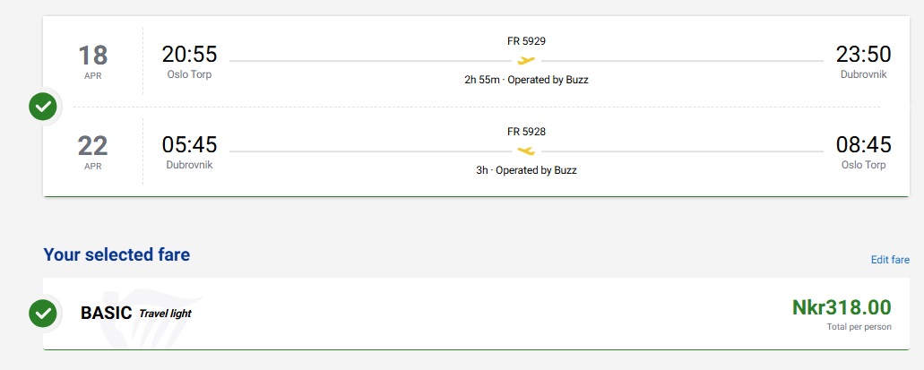 Ryanair lidojumi no Rīgas uz Oslo un no Oslo uz Dubrovniku. Lidojumi nav savienoti.