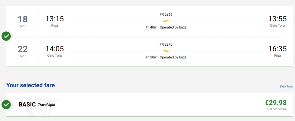 Rīga – Oslo – Rīga 18.-22.04. 30 EUR