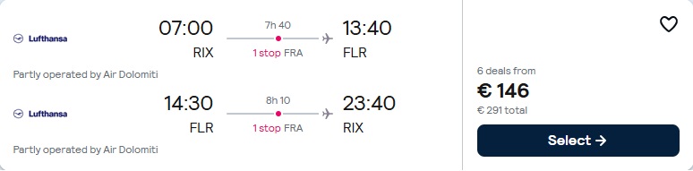Lidojumi no Rīgas uz Florenci ar pārsēšanos Frankfurtē.