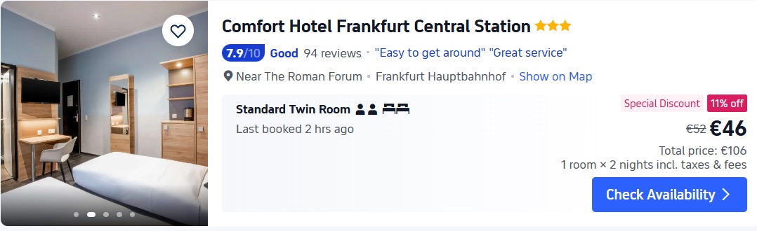 3* viesnīca Comfort Hotel Frankfurt Central Station. Divvietīgs numurs uz 2 naktīm – 106 EUR.