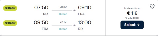 Tiešie Air Baltic lidojumi no Rīgas uz Frankfurti.