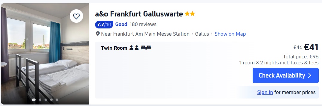 2* viesnīca a&o Frankfurt Galluswarte. Divvietīgs numurs uz 2 naktīm – 96 EUR.