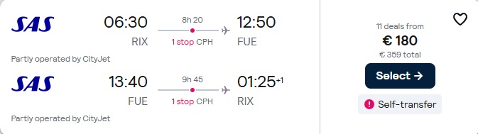 SAS lidojumi no Rīgas uz Fuerteventuru ar pārsēšanos Kopenhāgenā.