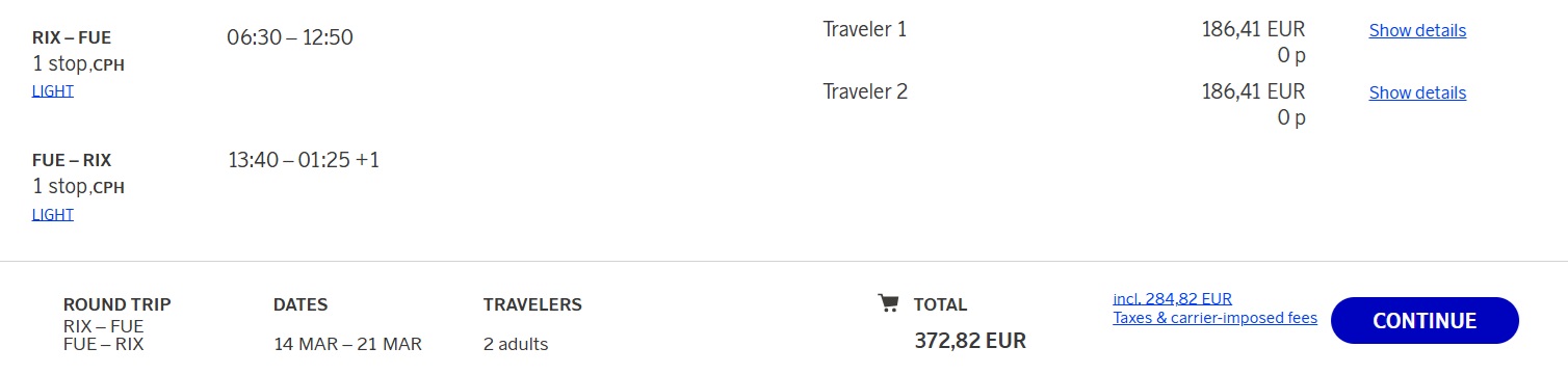 SAS lidojumi no Rīgas uz Fuerteventuru ar pārsēšanos Kopenhāgenā.