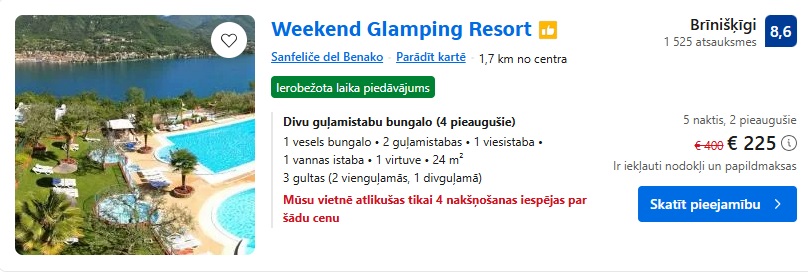 Glempings Weekend Glamping Resort. Divu guļamistabu bungalo uz 5 naktīm – 225 EUR.
