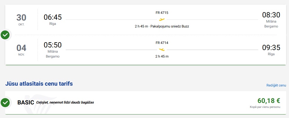 Tiešie Ryanair lidojumi no Rīgas uz Milānu Bergamo.