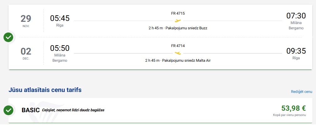 Tiešie Ryanair lidojumi no Rīgas uz Milānu Bergamo.