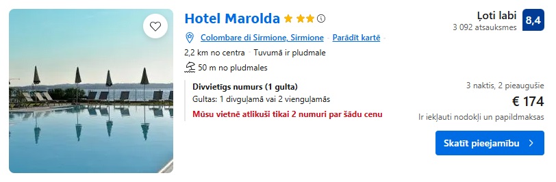 4* viesnīca Hotel Marolda. Divvietīgs numurs uz 3 naktīm – 174 EUR, ar brokastīm – 182 EUR.
