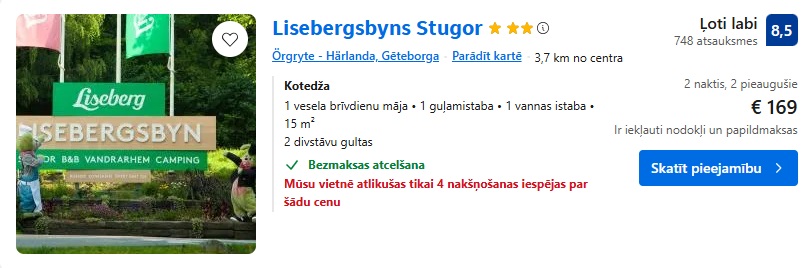 3* viesnīca Lisebergsbyns Stugor. Divvietīgs numurs uz 2 naktīm – 169 EUR.
