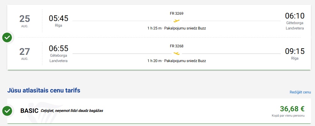Tiešie Ryanair lidojumi Rīga – Gēteborga (cenā nav iekļauta bagāža).