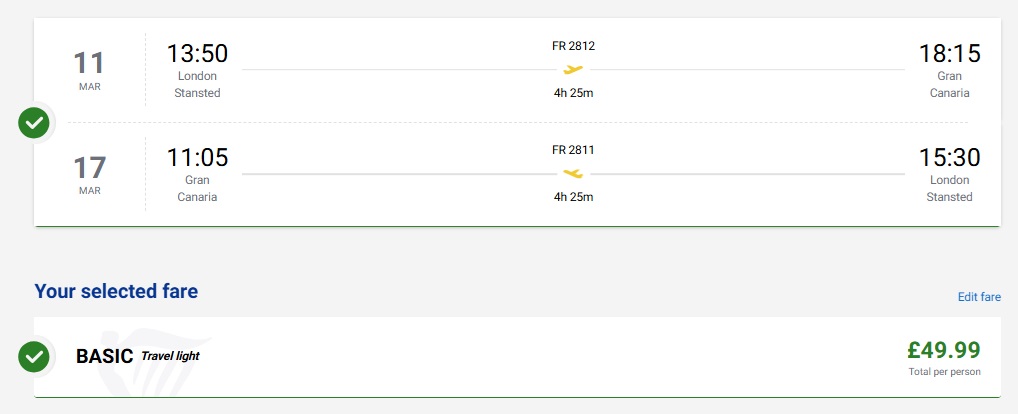 Ryanair lidojumi no Rīgas uz Londonu un no Londonas uz Grankanāriju (lidojumi nav savienoti).