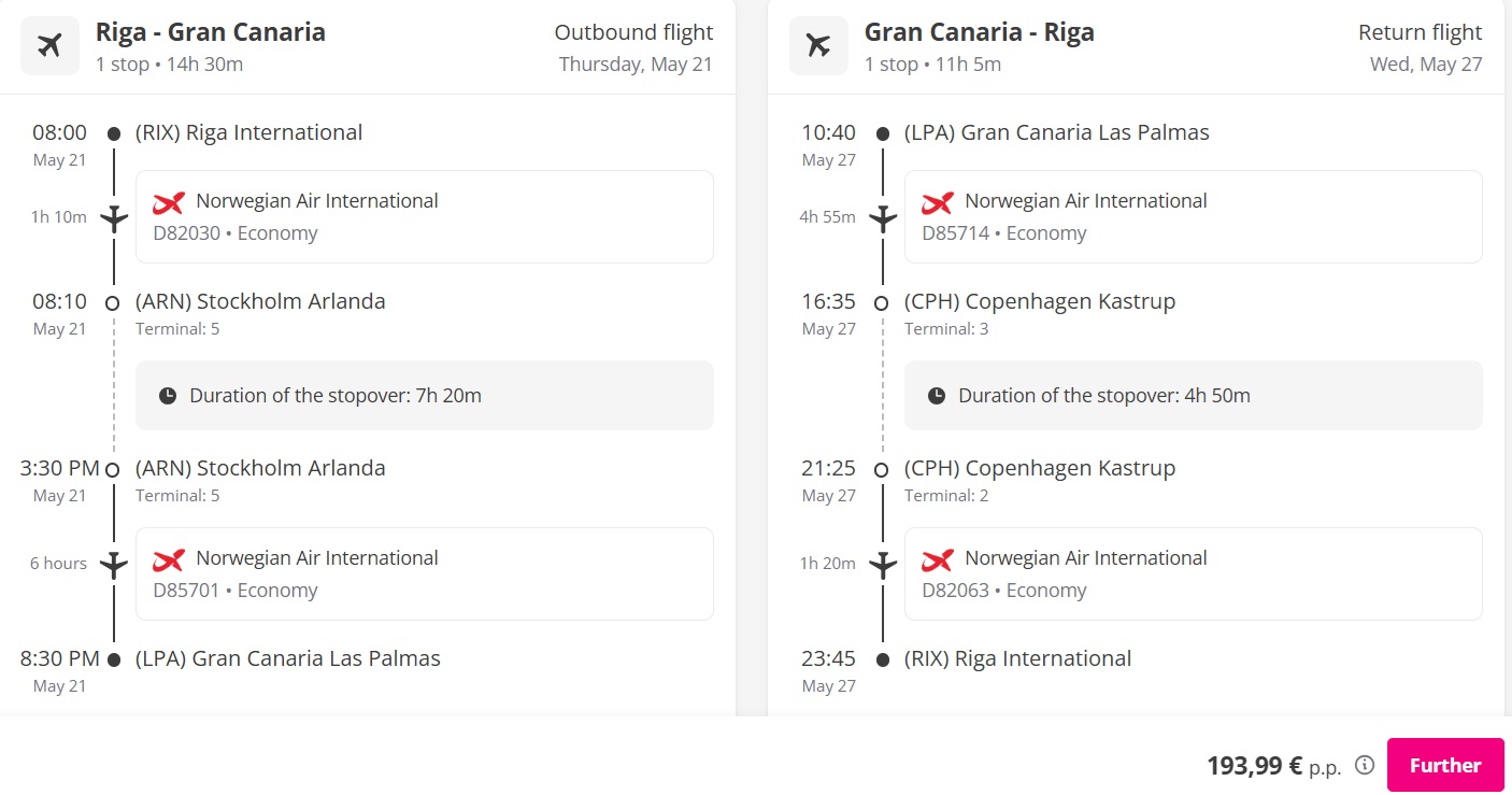 Norwegian lidojumi no Rīgas uz Grankanāriju ar pārsēšanos Stokholmā/Kopenhāgenā (lidojumi nav savienoti).