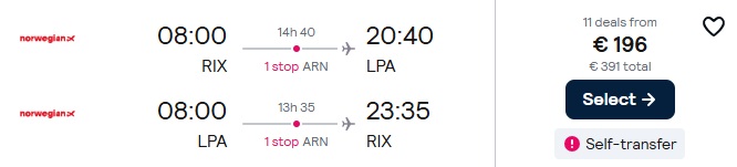 Norwegian lidojumi no Rīgas uz Grankanāriju ar pārsēšanos Stokholmā (lidojumi nav savienoti).