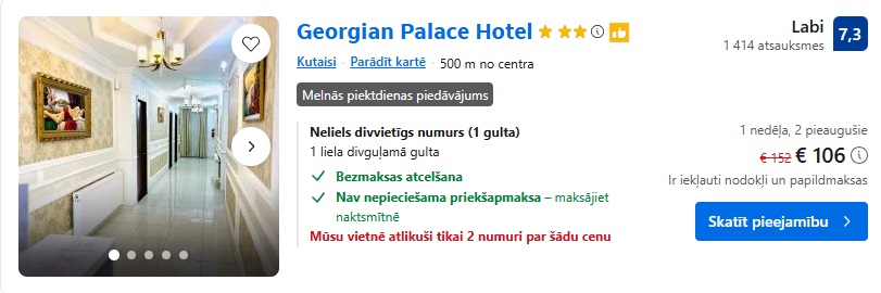 3* viesnīca Georgian Palace Hotel. Divvietīgs numurs uz 7 naktīm – 106 EUR.