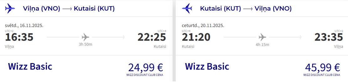 Viļņa – Kutaisi piem. 16.-20.11. 71 EUR turp un atpakaļ ar Wizz Air Club vai 91 EUR bez